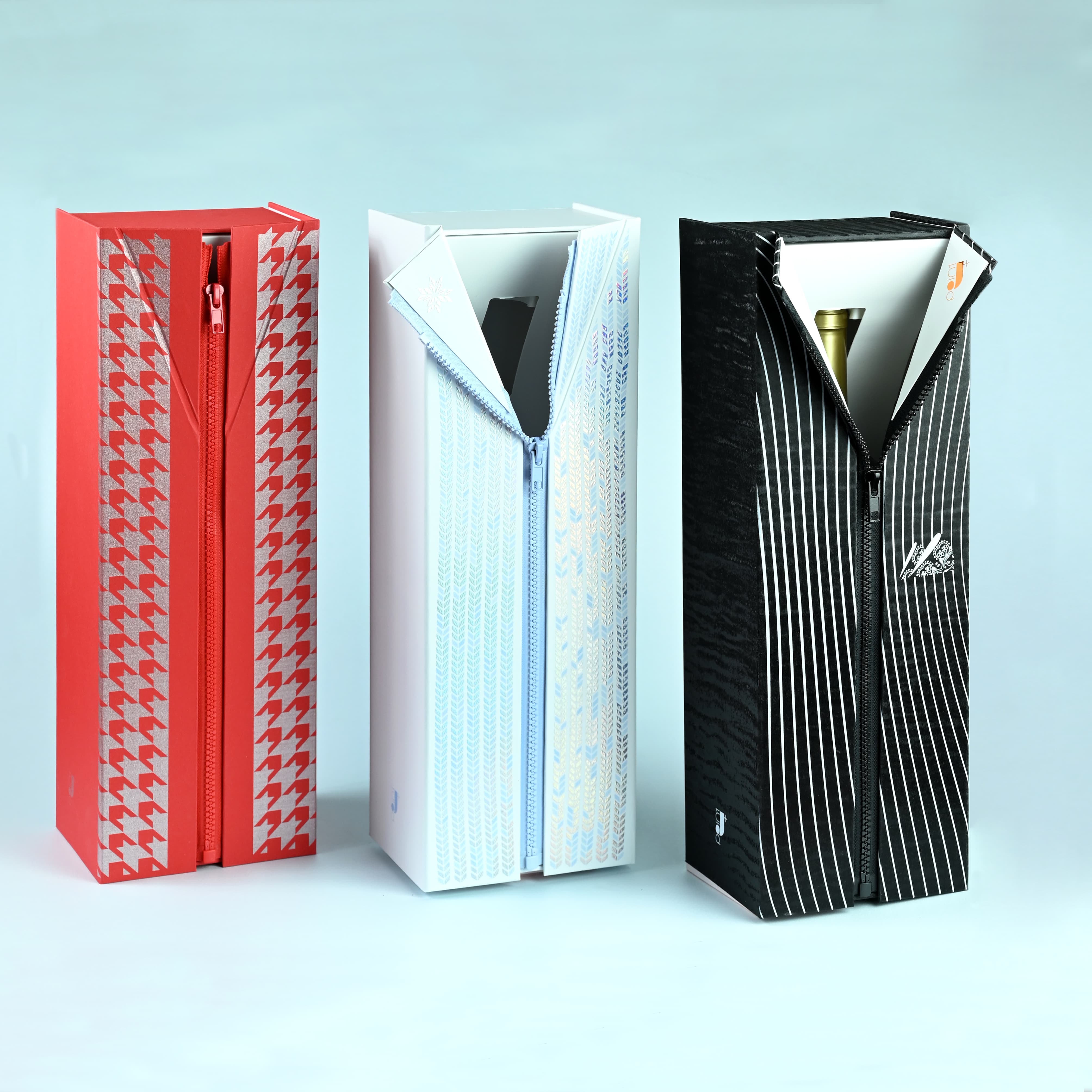 Новата ни кутия Zipper Box поставя вашия продукт на пиедестал. Тя е перфектна за разкошна бутилка вино или друго луксозно произведение. Усетете вълнението от примамливото затваряне с цип.