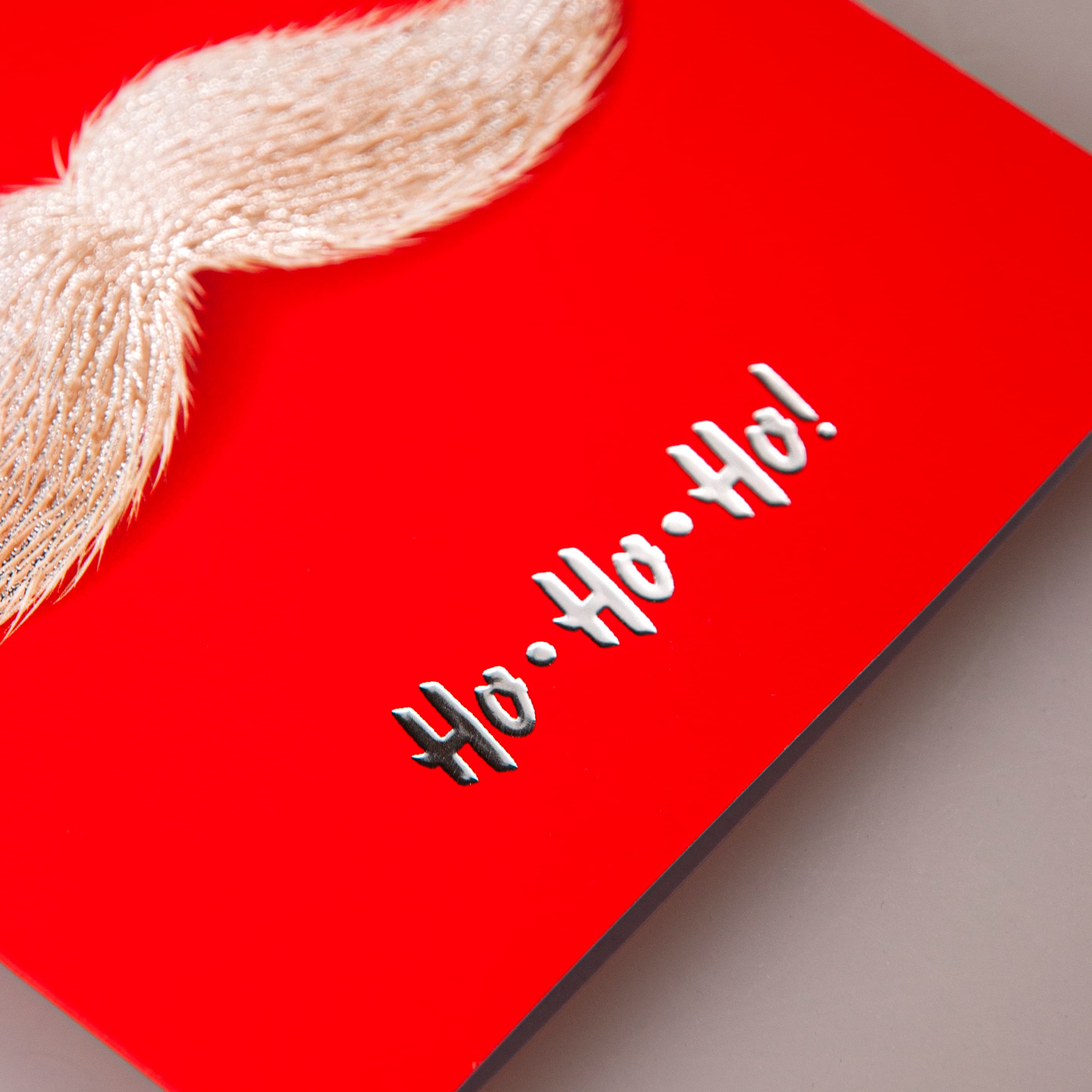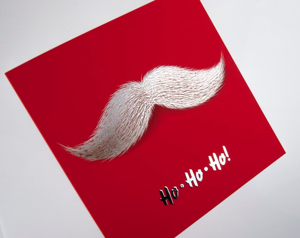 Коледна картичка с кадифен ламинат, liquid metal печат от сребърно фолио и дигитален UV лак.
