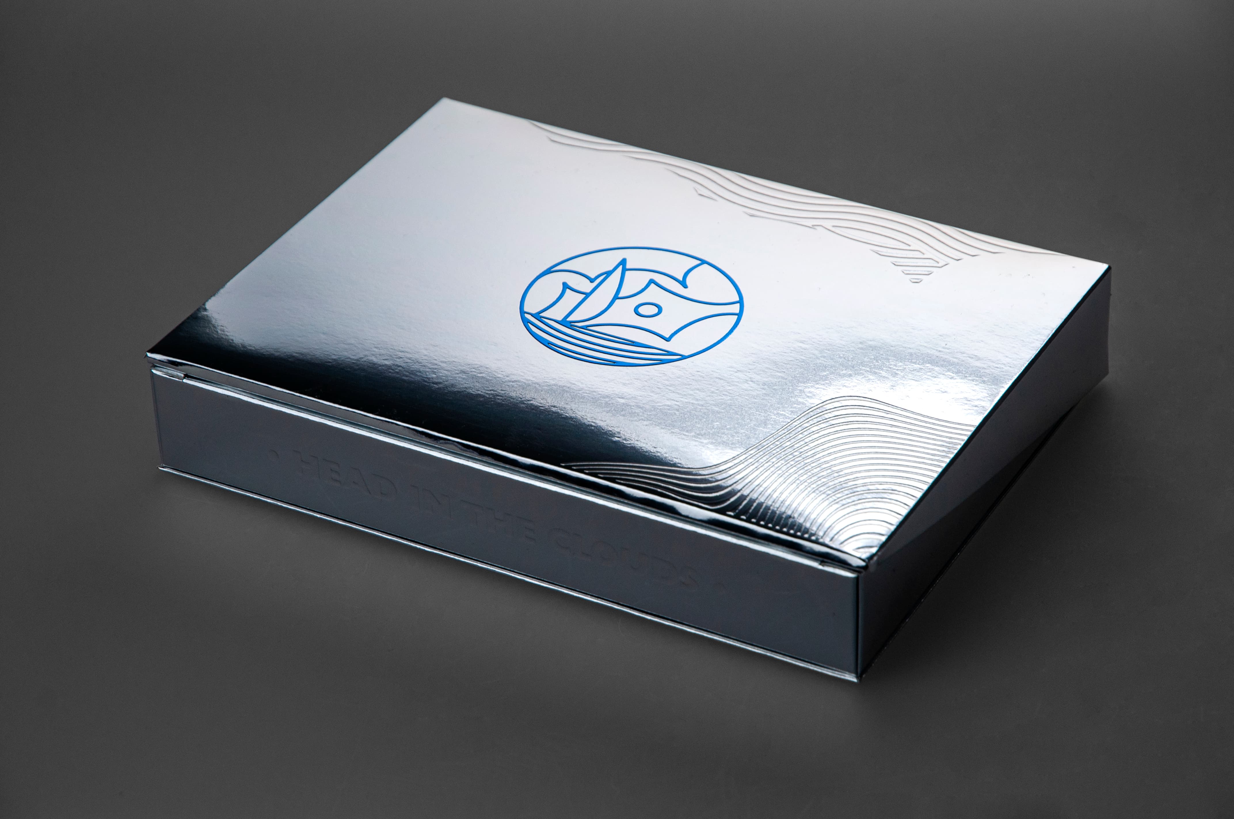 Кутия HEAD IN THE CLOUDS' с релфен UV лак и синьо liquid metal фолио.