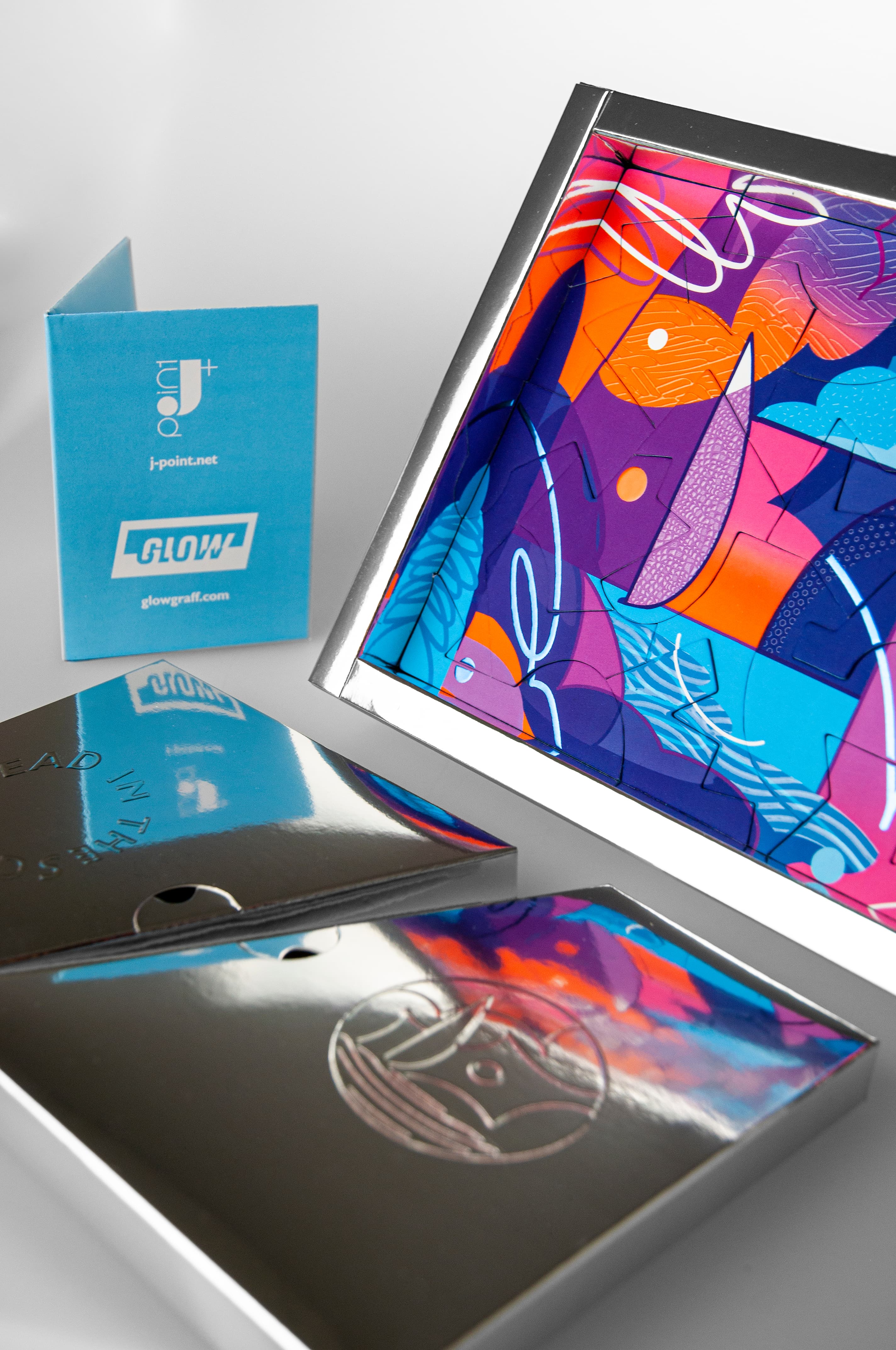 Като големи почитатели на уличното изкуство, търсихме начин да пренесем графити изкуството от улиците в ежедневието на хората. Решихме да си сътрудничим с GLOW, един невероятно талантлив художник с отличителен цветен абстрактен стил. Работата на GLOW е силно вградена в градската среда и той постига положителна трансформация на публичното пространство благодарение насвоя отличителен и разпознаваем стил.Хрумна ни идеята да превърнем една от творбите на GLOW, създадени специално затози проект, в абстрактен пъзел и като бонус – подписан плакат. Когато се сглоби в кутията си, пъзелът се превръща в картина за бюро.