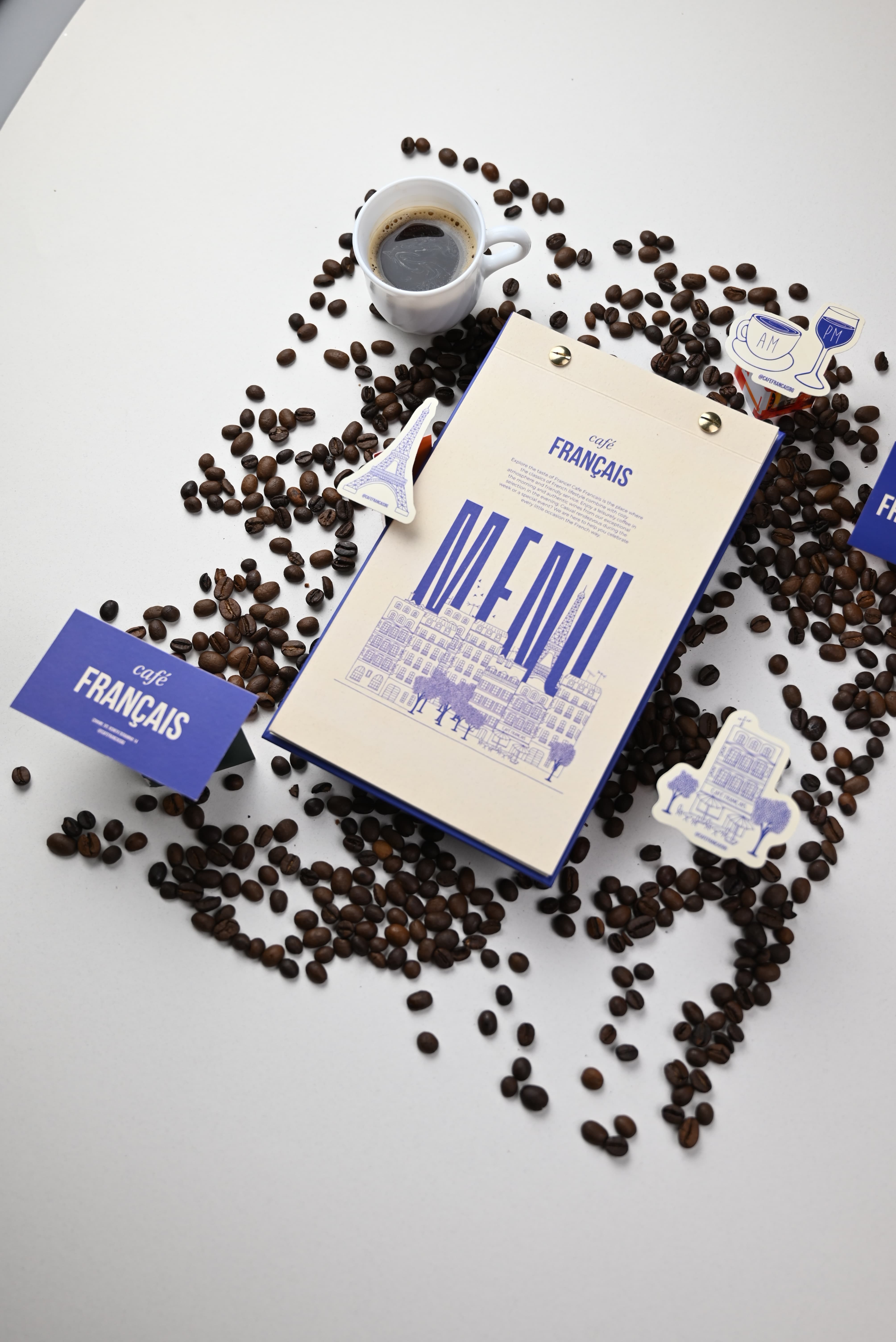 Меню с твърди корици и капси и стикери с мат ламинат за Café Français.