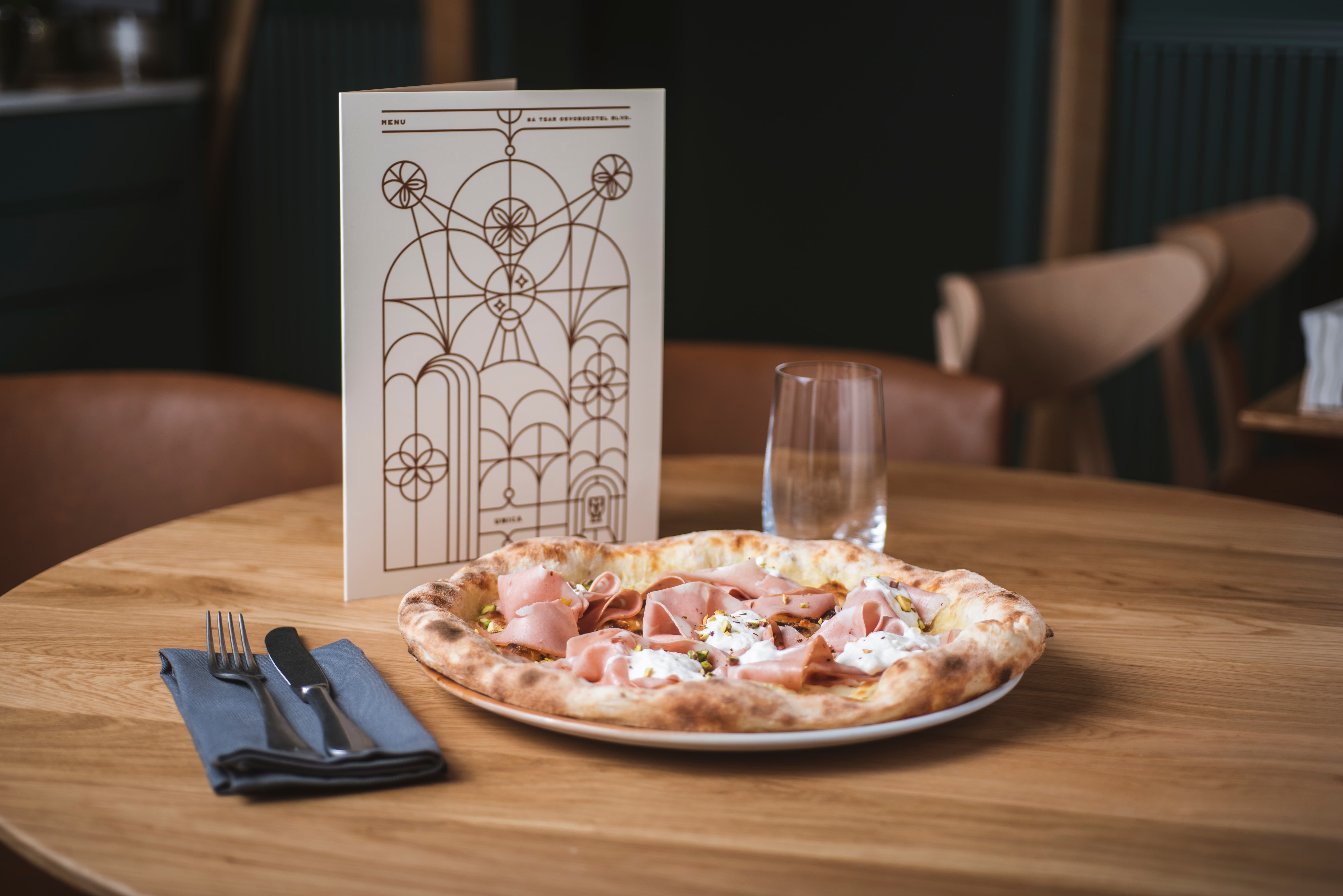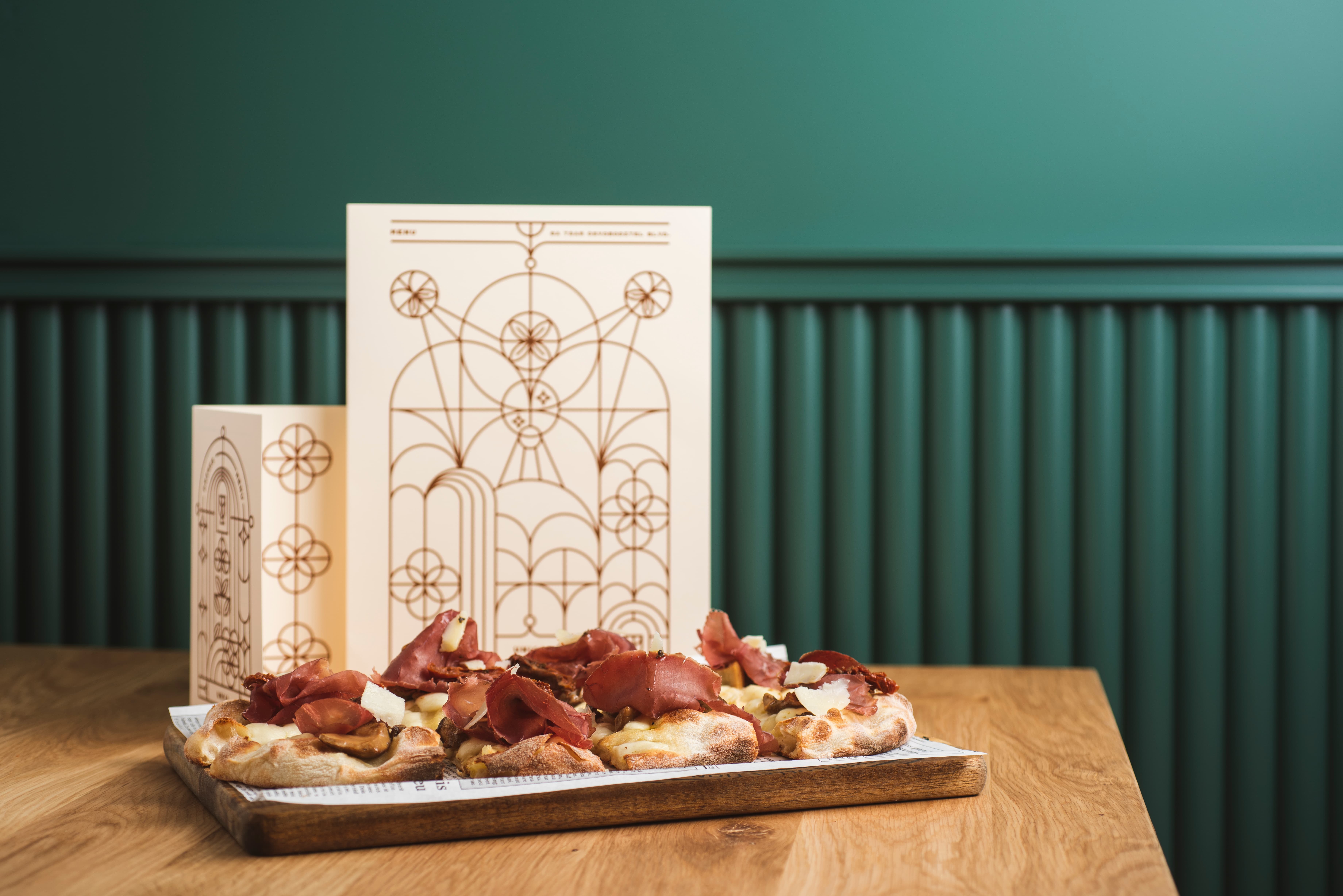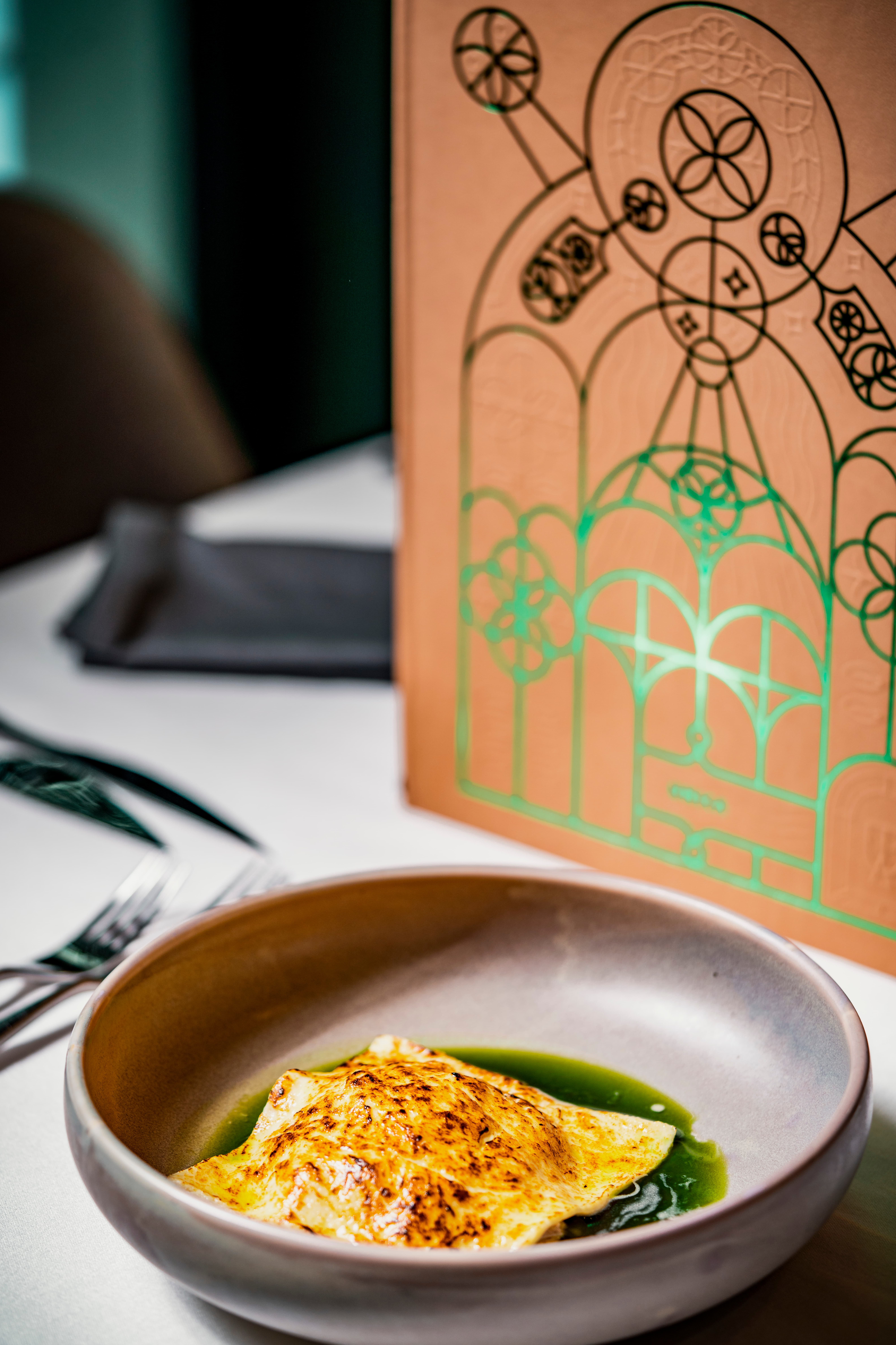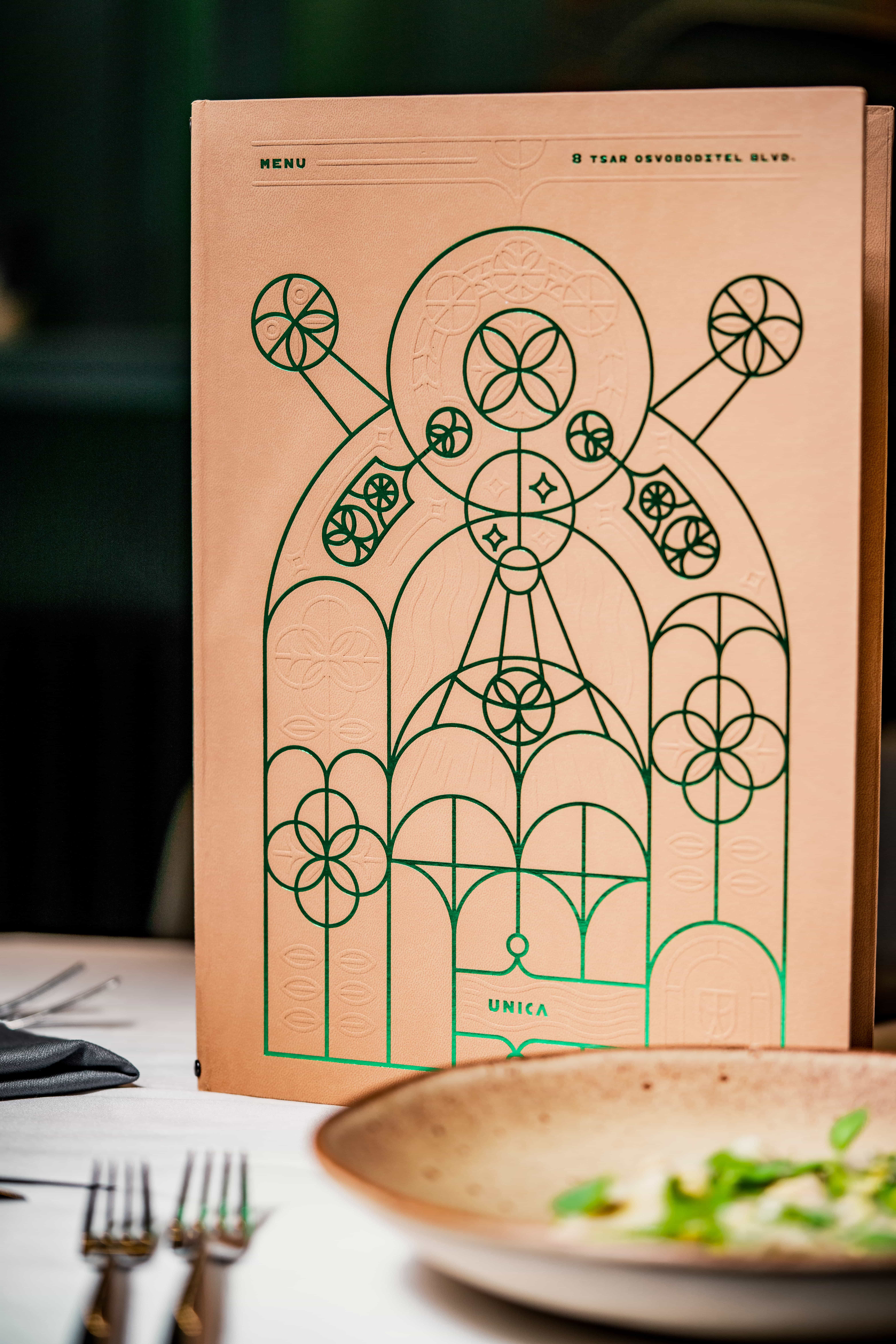 Серия от меню, винен лист и сметник с твърди кожени корици, преге печат и liquid metal печат в зелено за ресторант Unica.