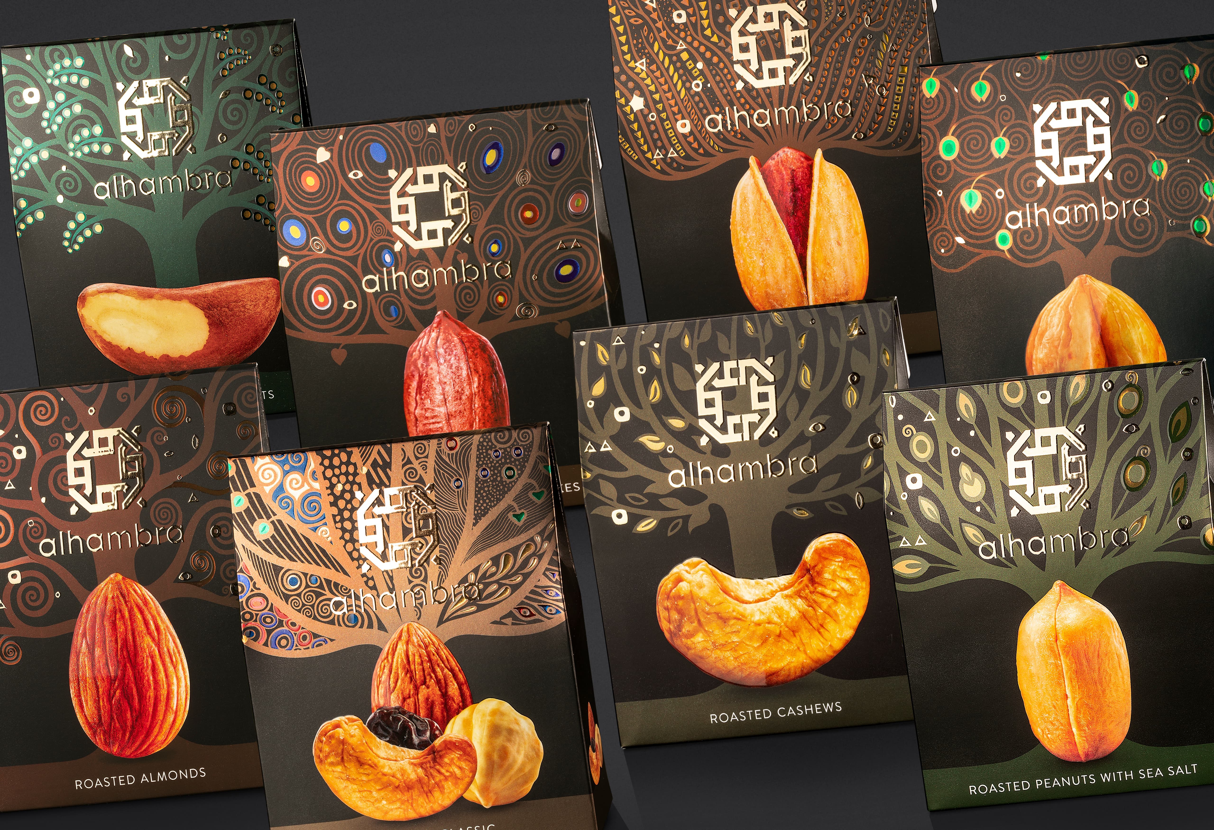 Няколко разновидности на опаковки за ядки, с добавен 3D UV лак и liquid metal фолио. Всяка кутия е с изображение на растението, от което произлизат съответните ядки.