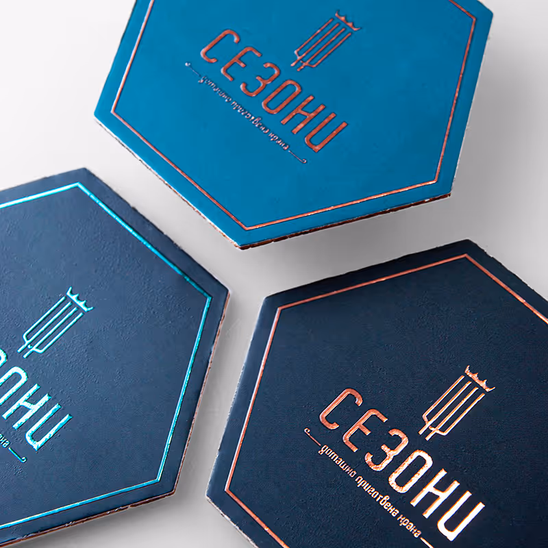 Подложки за чаши за ресторант Сезони с естествен корк и акценти от различни liquid metal фолиа.