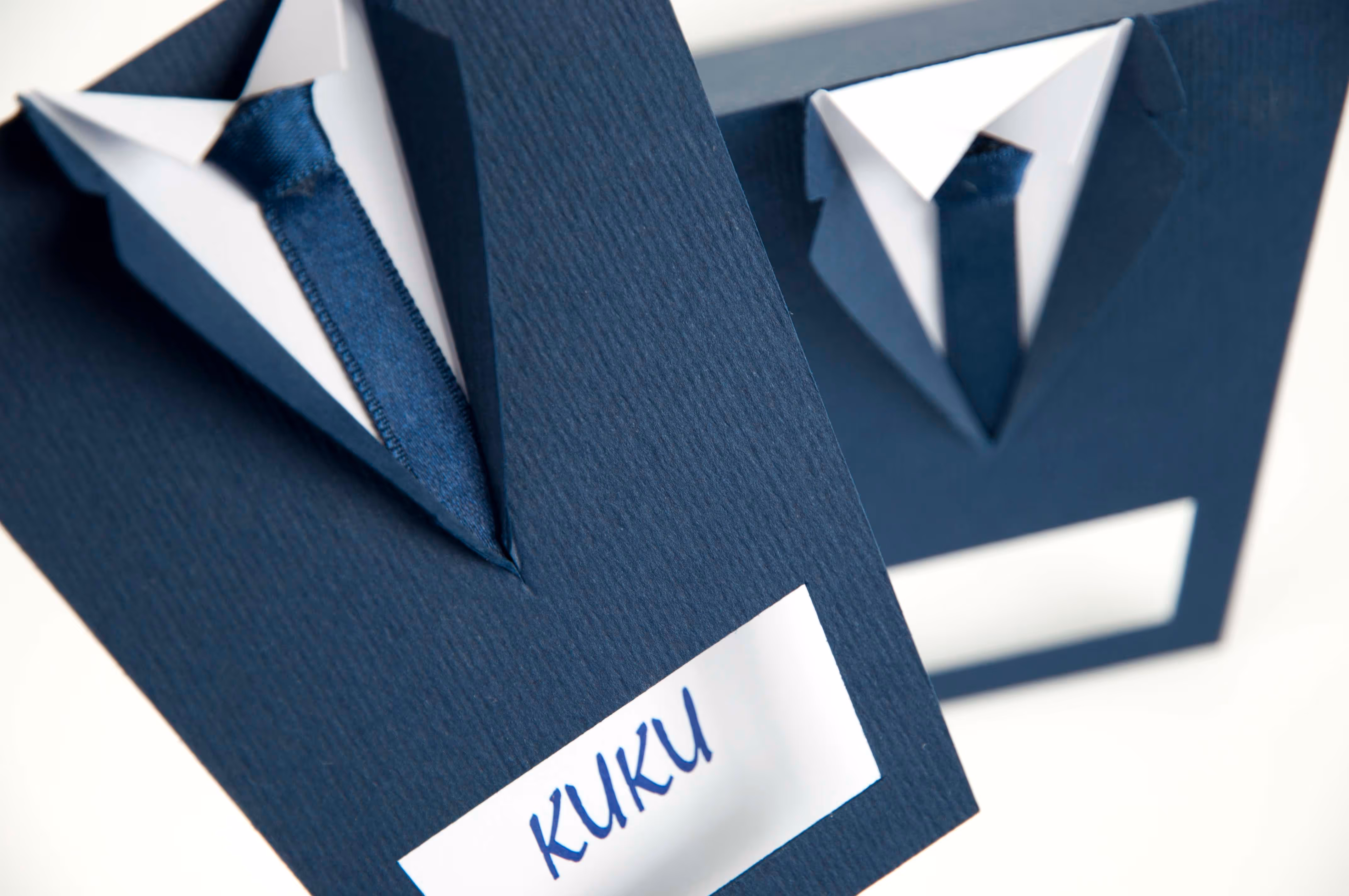 Нестандартна покана-костюм от щанцована релефна хартия с мини текстилна вратовръзка.