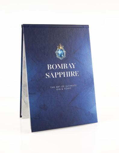 Pop-up меню Bombay Sapphire с дигитален UV лак, liquid metal печат със златно фолио и изрязване по контур.