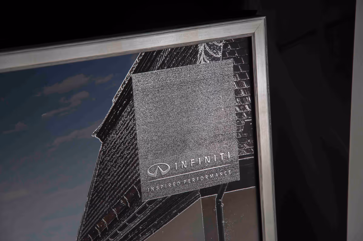 B2 формат стенен принт за модел на Infiniti на Витоша Ауто, изпълнен с liquid metal печат със сребърно фолио и дигитален UV лак, които елегантно подчертават нюансите на обкръжаващата среда и архитектура и модернистичните контури на автомобила.