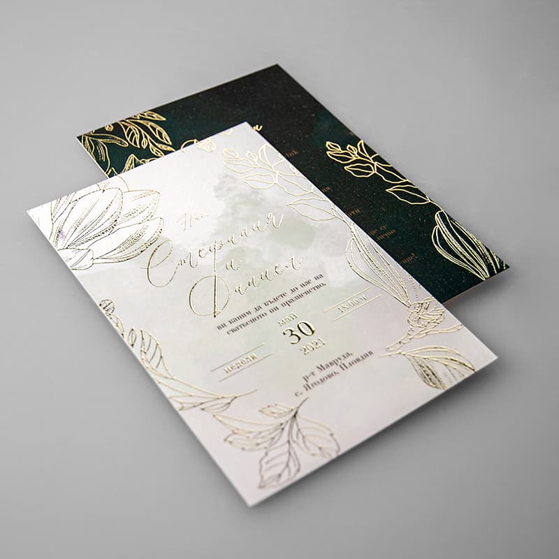 В допълнение предлагаме широка гама от различни ламиниращи фолиа, частичен UV лак, liquid gold печат, щанцоване по профил, сухо преговане, и други специални ефекти. Поканите за вашия празник, парти, сватба, рожден ден или друго специално събитие, могат да бъдат с персонализирани послания и с персонализирани имена. За всеки размер покана можем да изработим и индивидуален плик.