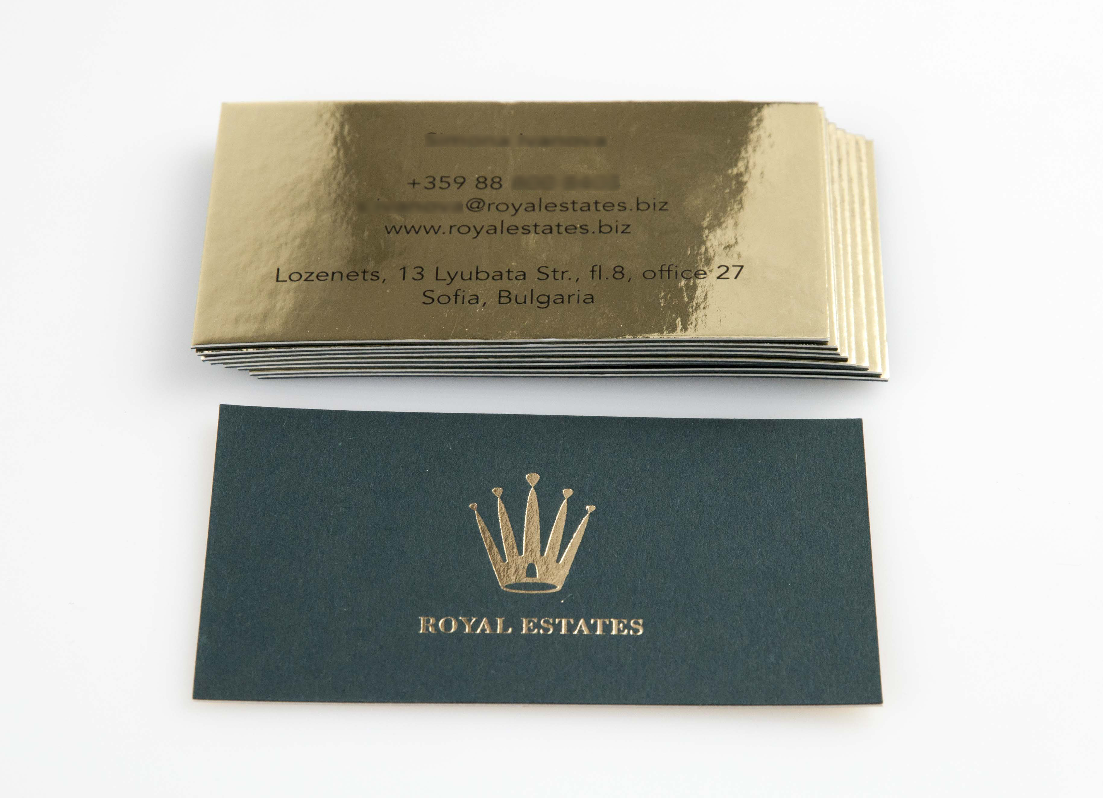 Каширани визитки от златен картон, топъл печат и ситопечат.