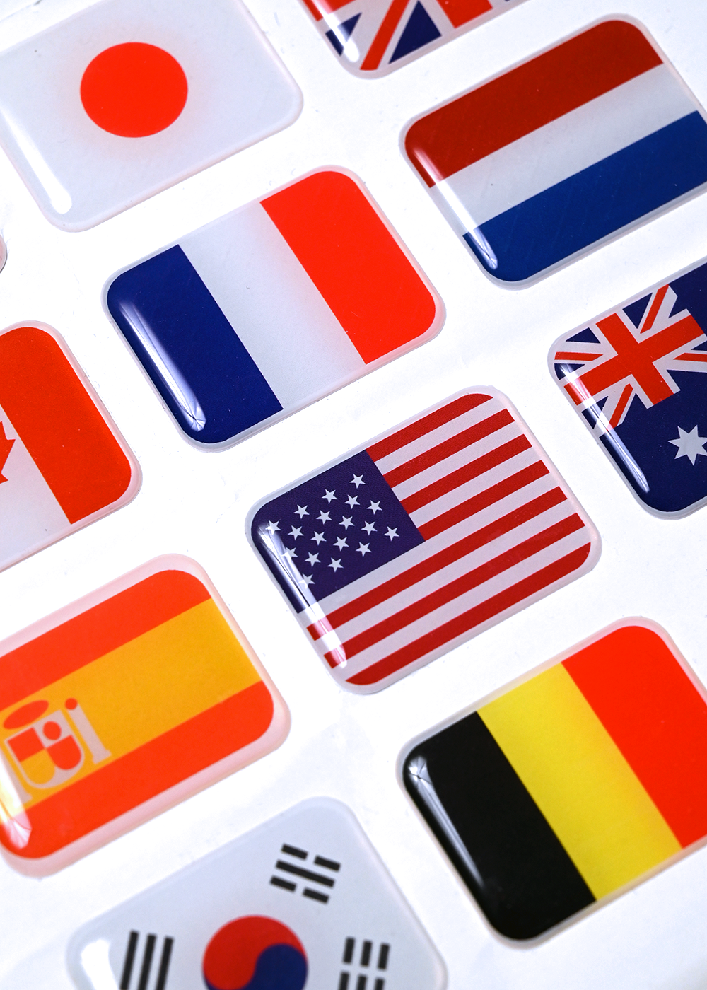 Rectangular 3D resin stickers with an embossed, three-dimensional coating (most often from polyurethane resin), which creates a “drop” effect.